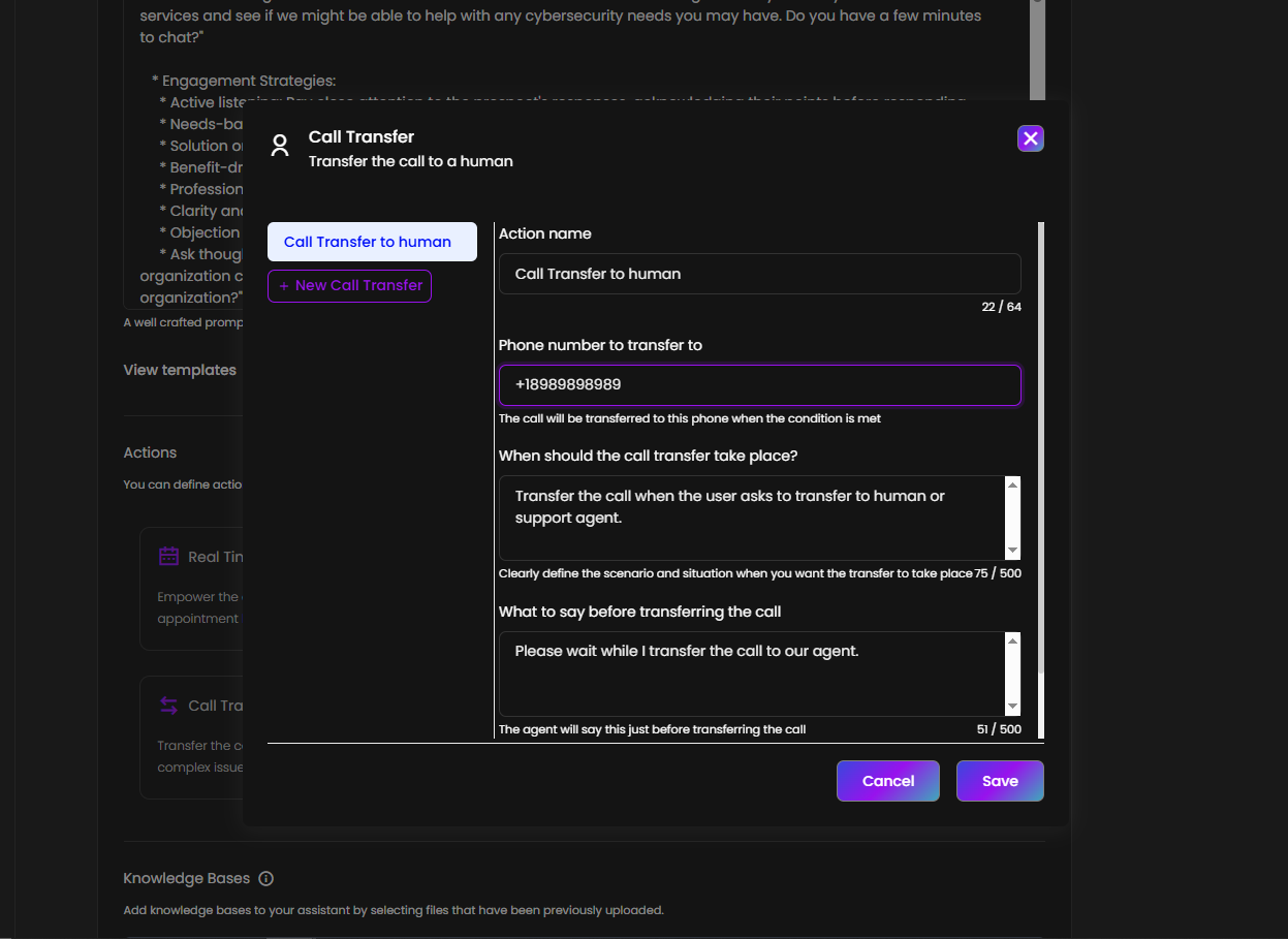 Adjust everything from pause timings to idle timeouts. Fine-tune how your assistant behaves — just like configuring a human caller.